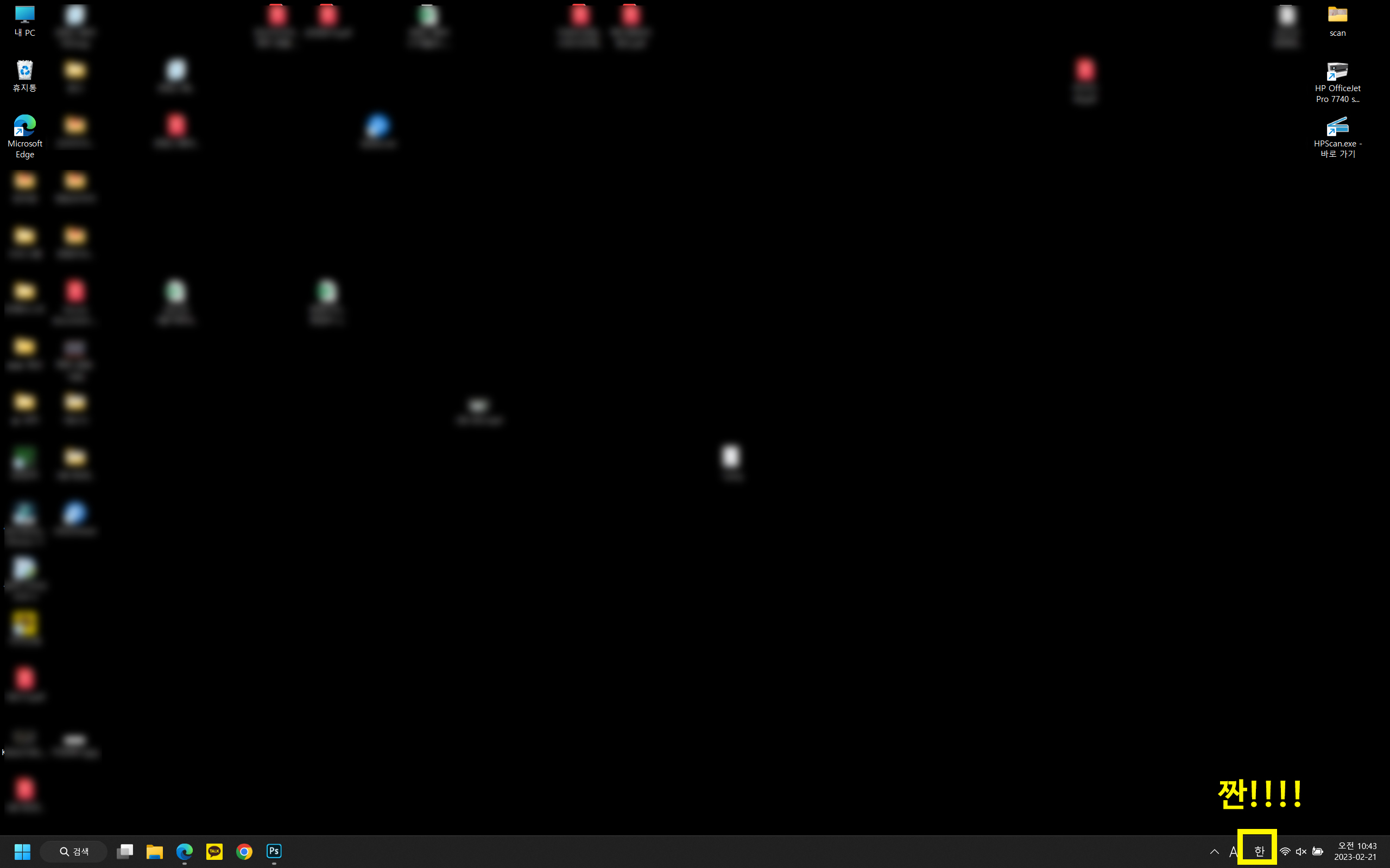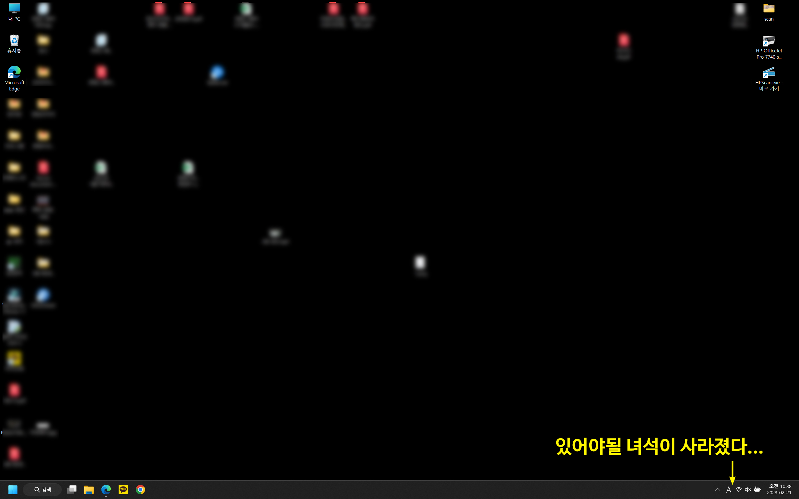 갑자기 한글이 써지지도 않는 상태일뿐만 아니라, 본래 자리에 있어야 할 한글입력기도 사라진 상태입니다.